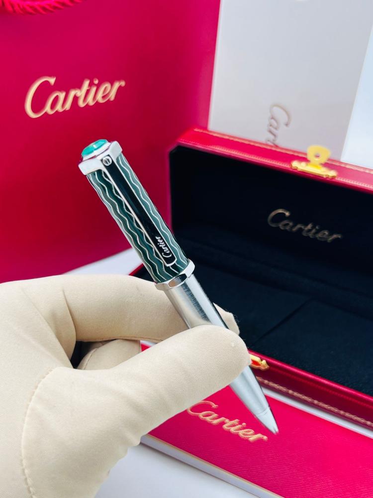 قلم حبر جاف (بولبوينت) من مجموعة "سانتوس دو كارتييه"، موديل الحجم الكبير، هيكل من المعدن المصقول وغطاء مطلي باللّكر باللون الأزرق الداكن واللون الأزرق السماوي، راتين بلون الزيتي، تفاصيل مطلية بالبلاديوم.